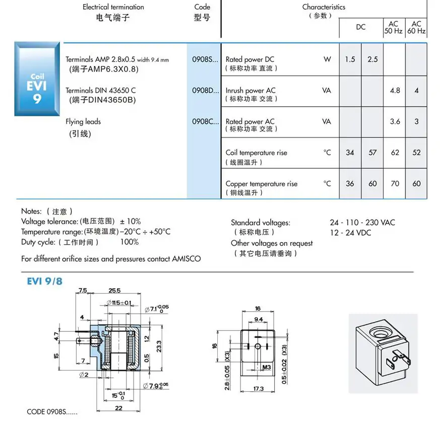 下一篇:阿米斯科AMISCO電磁閥線圈EVI7/9 AC220V DC24V 6VA 5VA 3W 4.8W